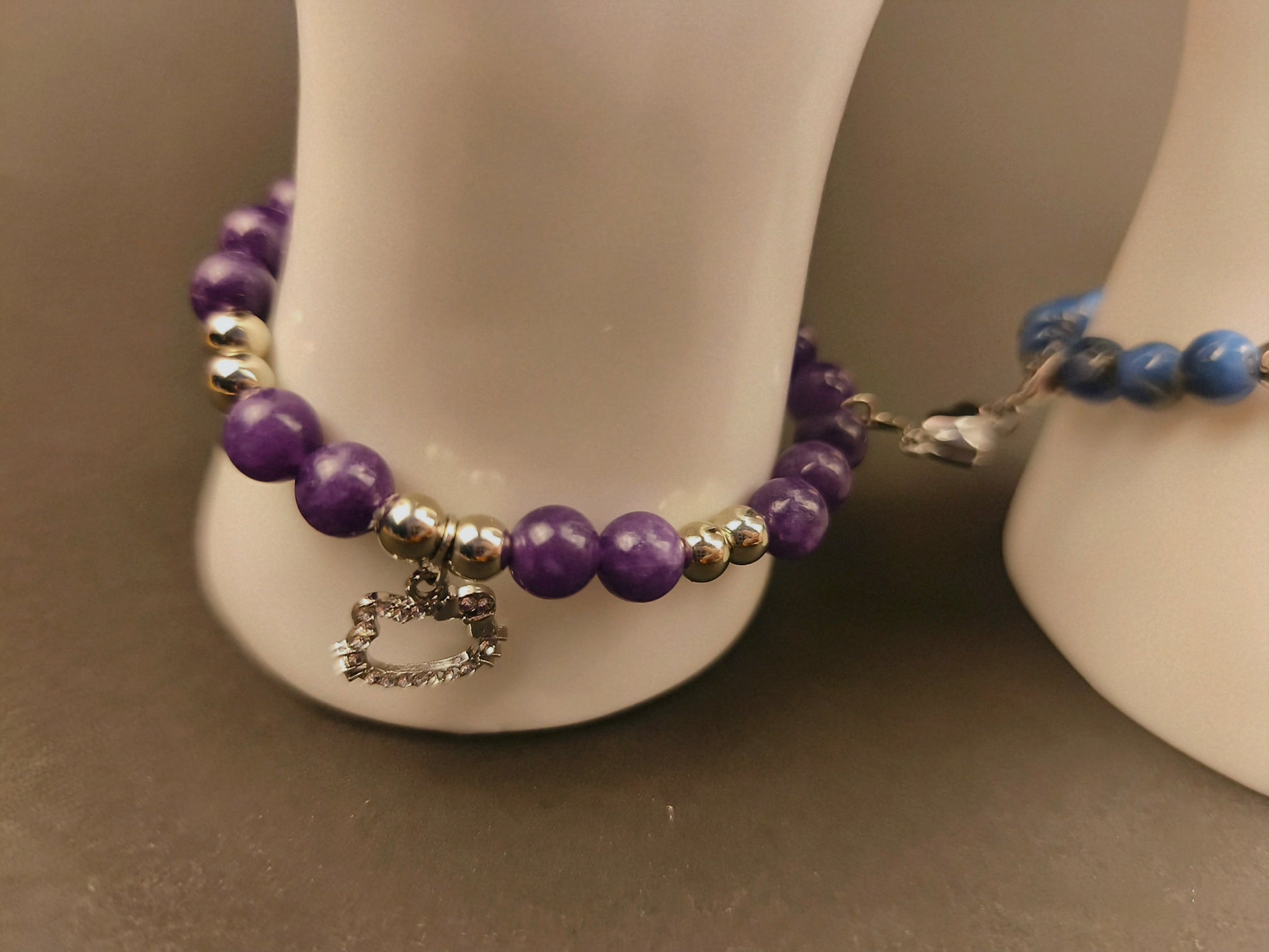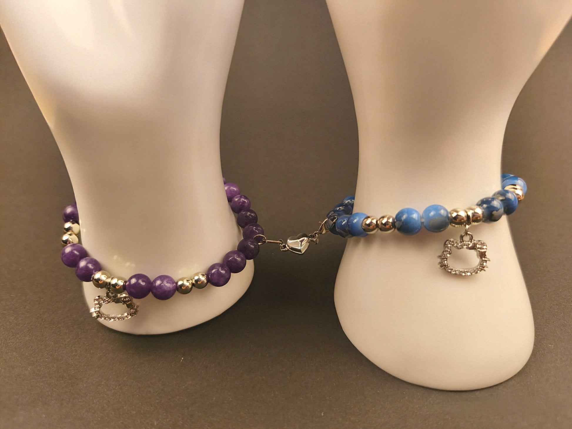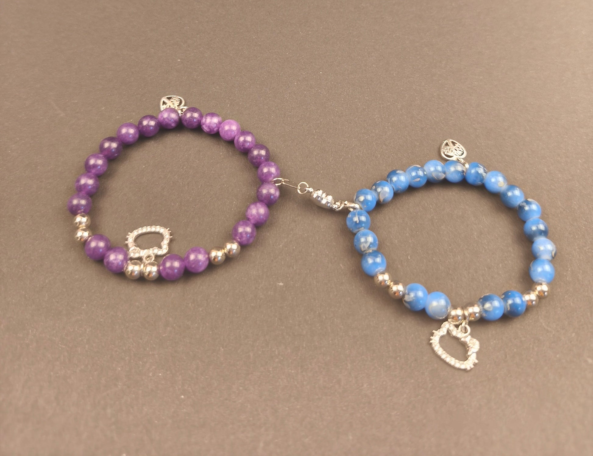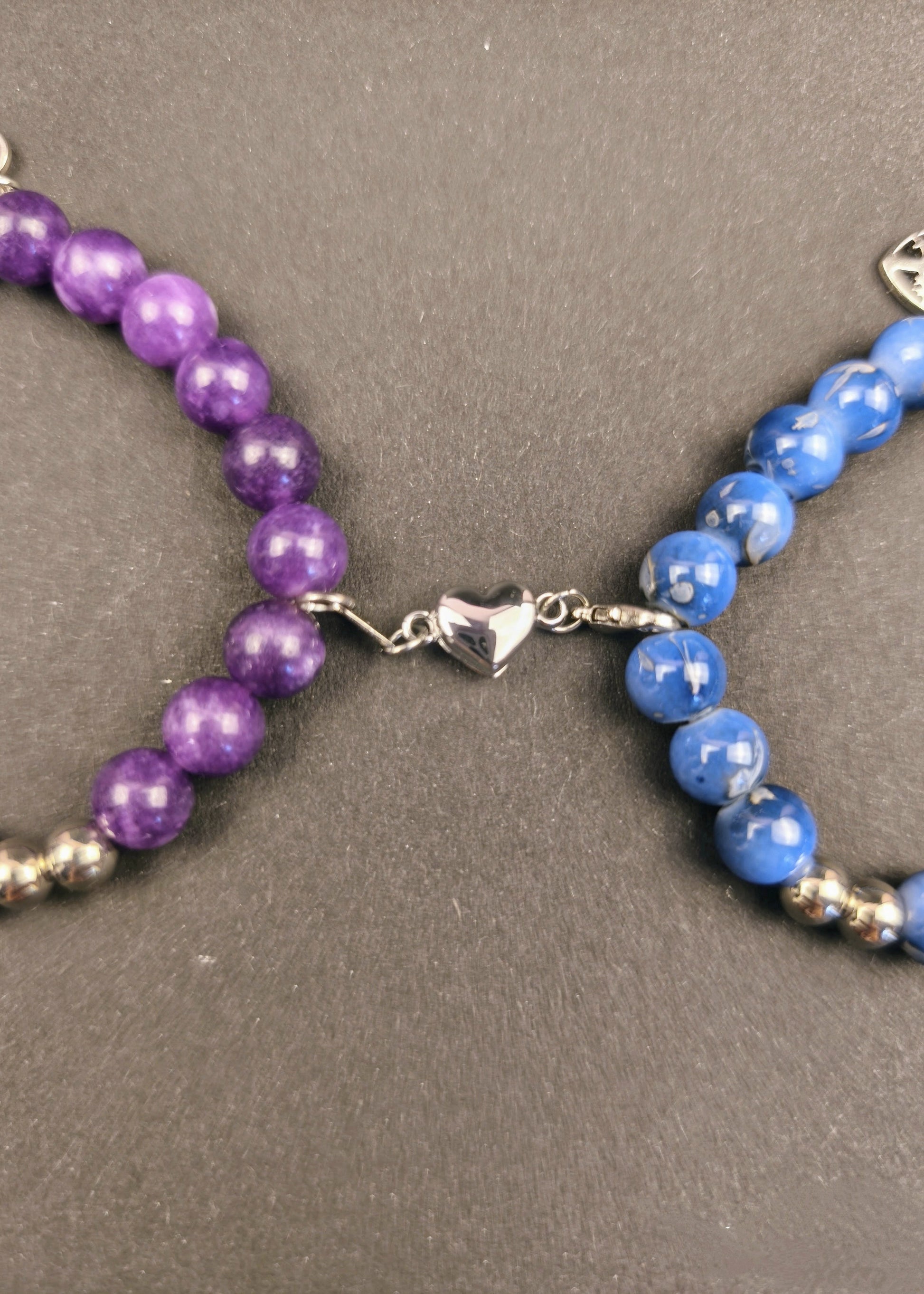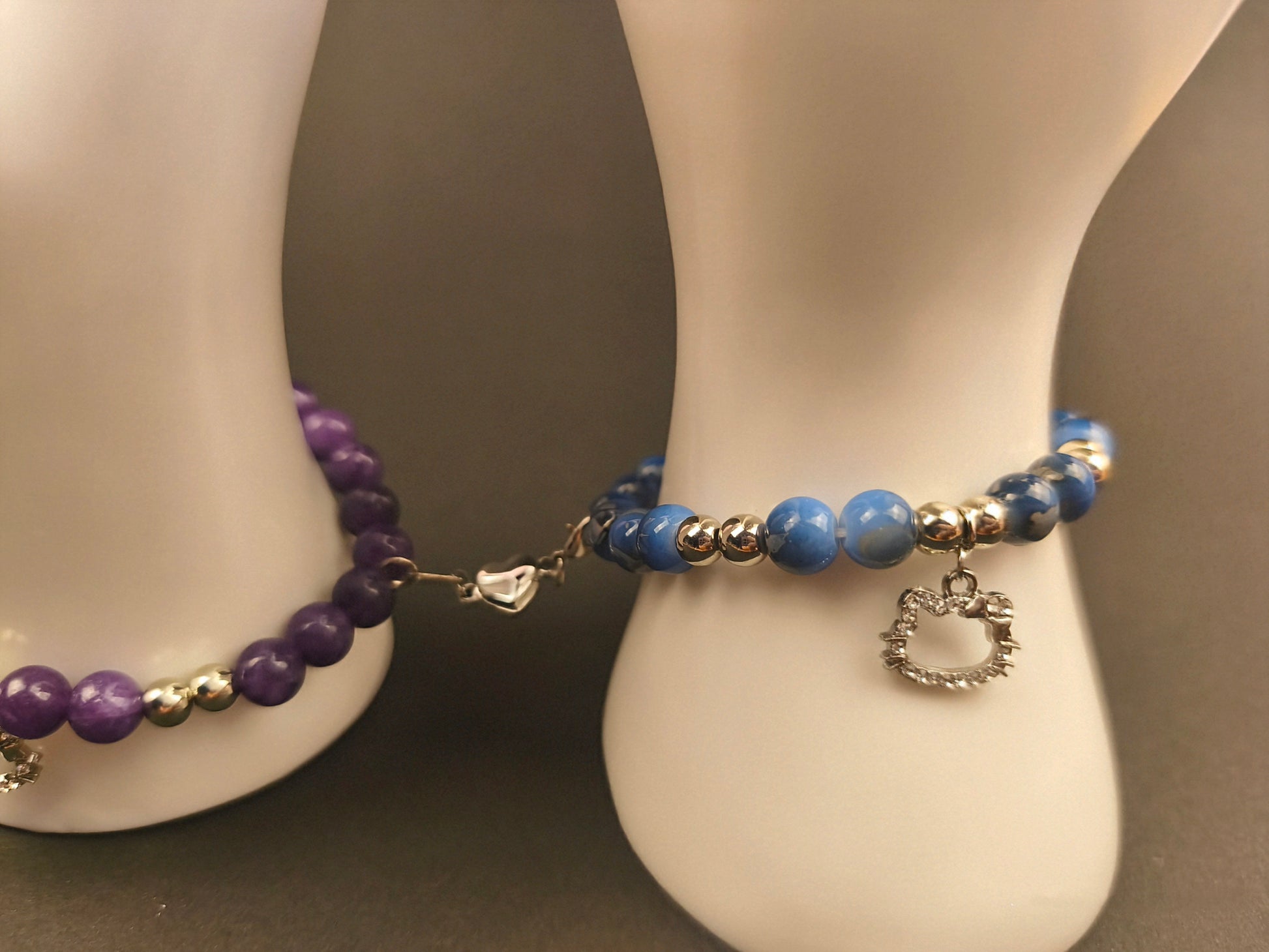 Dieses zauberhafte Armband-Pärchen ist ein Kuscheltraum für eure Handgelenke:"sanfte Perlen und liebevolle Details erzählen von unendlichem Zusammenhalt." Das erste Armband funkelt mit 8 mm blau-schwarzen Marmoriten-Glasperlen, gekrönt von einem winzigen Kitty Anhänger der euch stets ein Lächeln schenkt, und einen zarten Lebensbaum, der eure Freundschaft wurzelt. Das zweite Armband verzaubert mit 8 mm violetten Amethyst-Natursteinen, die in sanftem Licht schimmern, und trägt denselben verspielten Kitty-Kopf und Lebensbaum-Anhänger. Zum süßen Höhepunkt verbinden sich die magnetischen Herz-Verschlüsse, sobald ihr zusammenrückt. Dann zaubern sie im Handumdrehen ein gemeinsames Herz voller Wärme. Jede Perle, jeder Anhänger flüstert:"Mit dir ist mein Herz niemals allein"