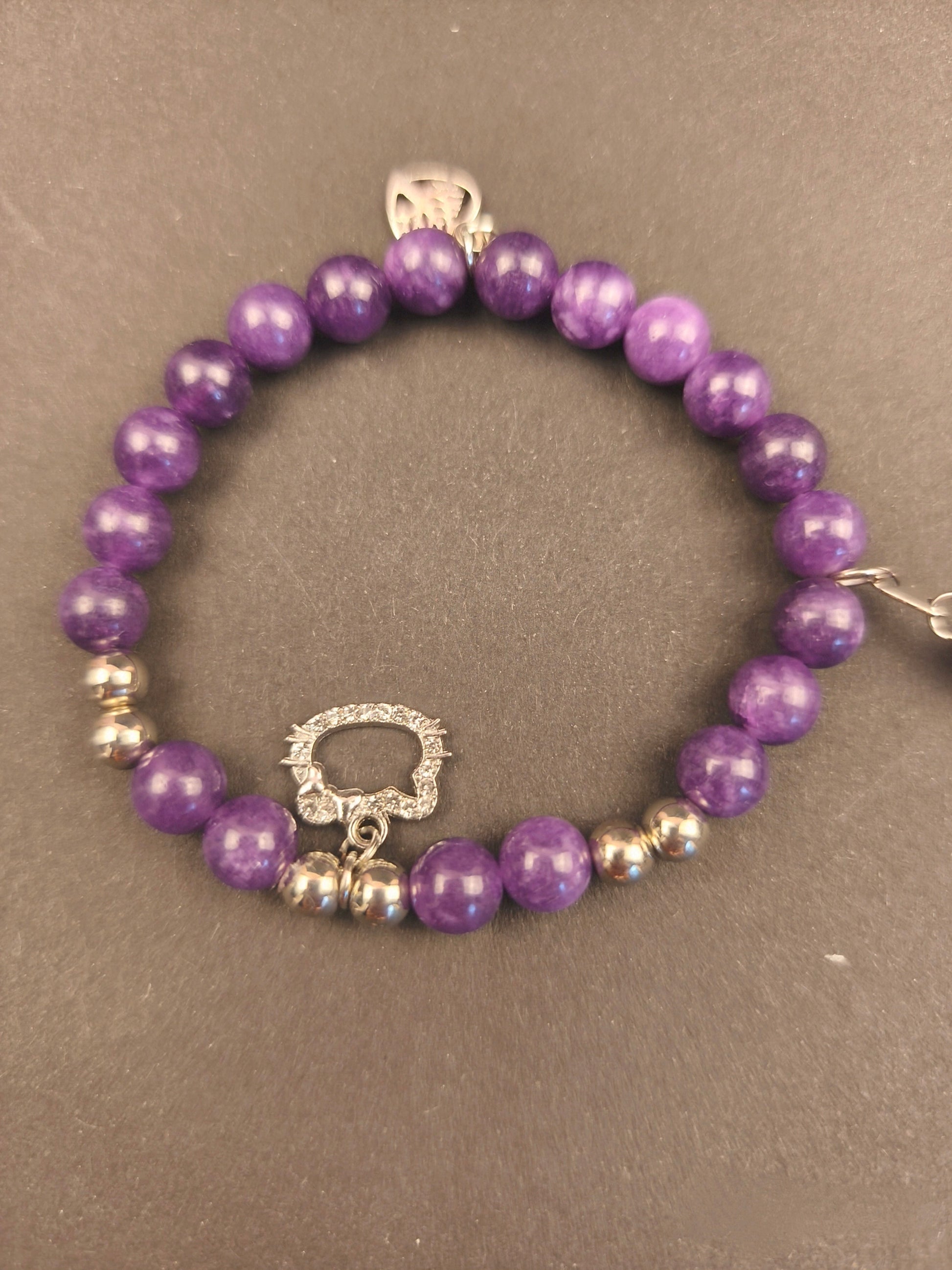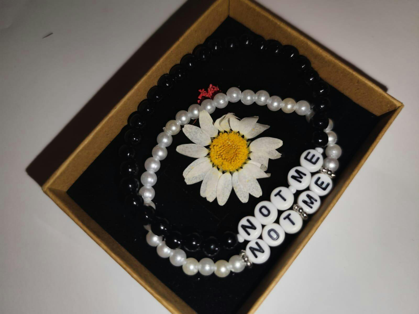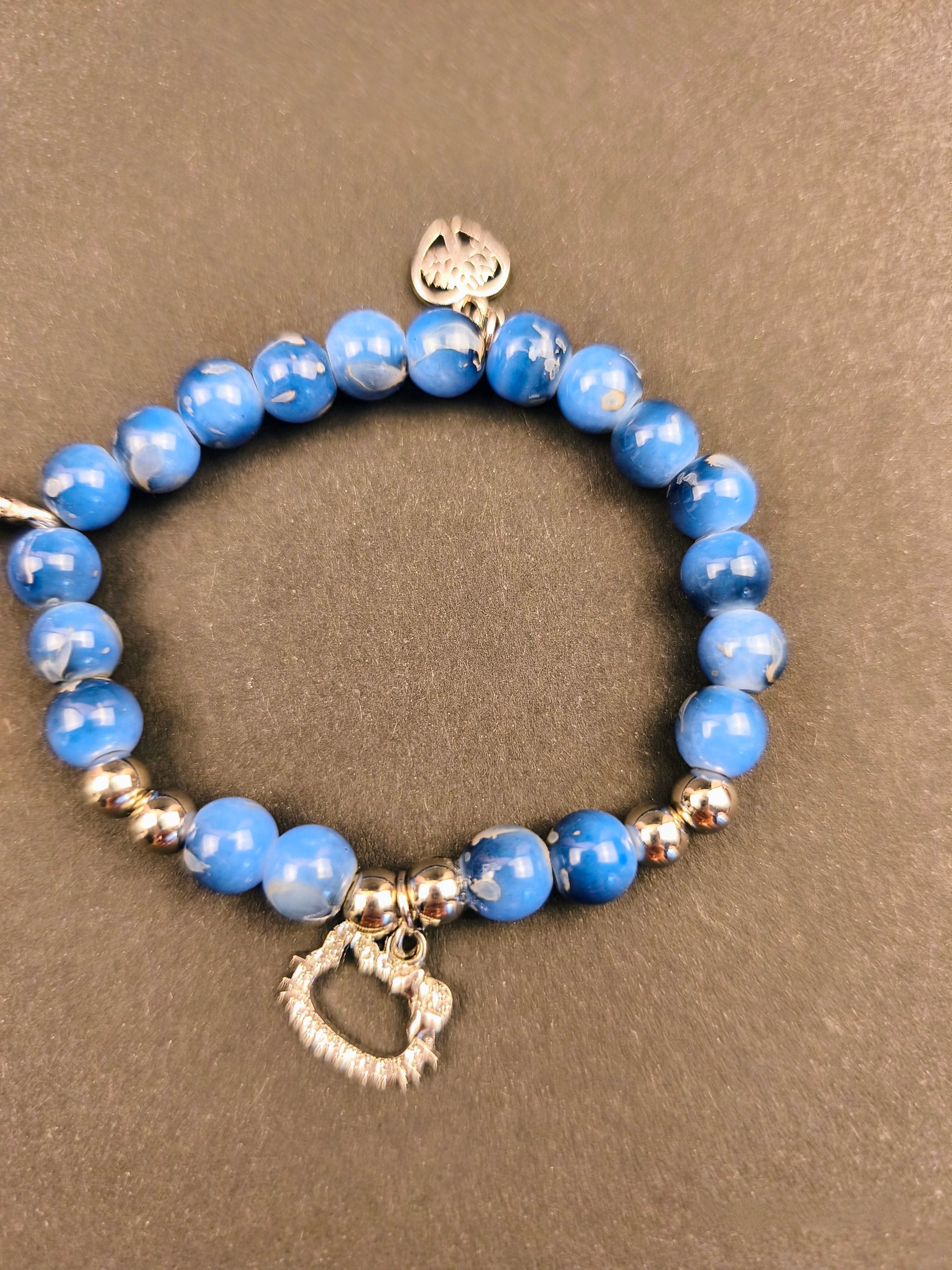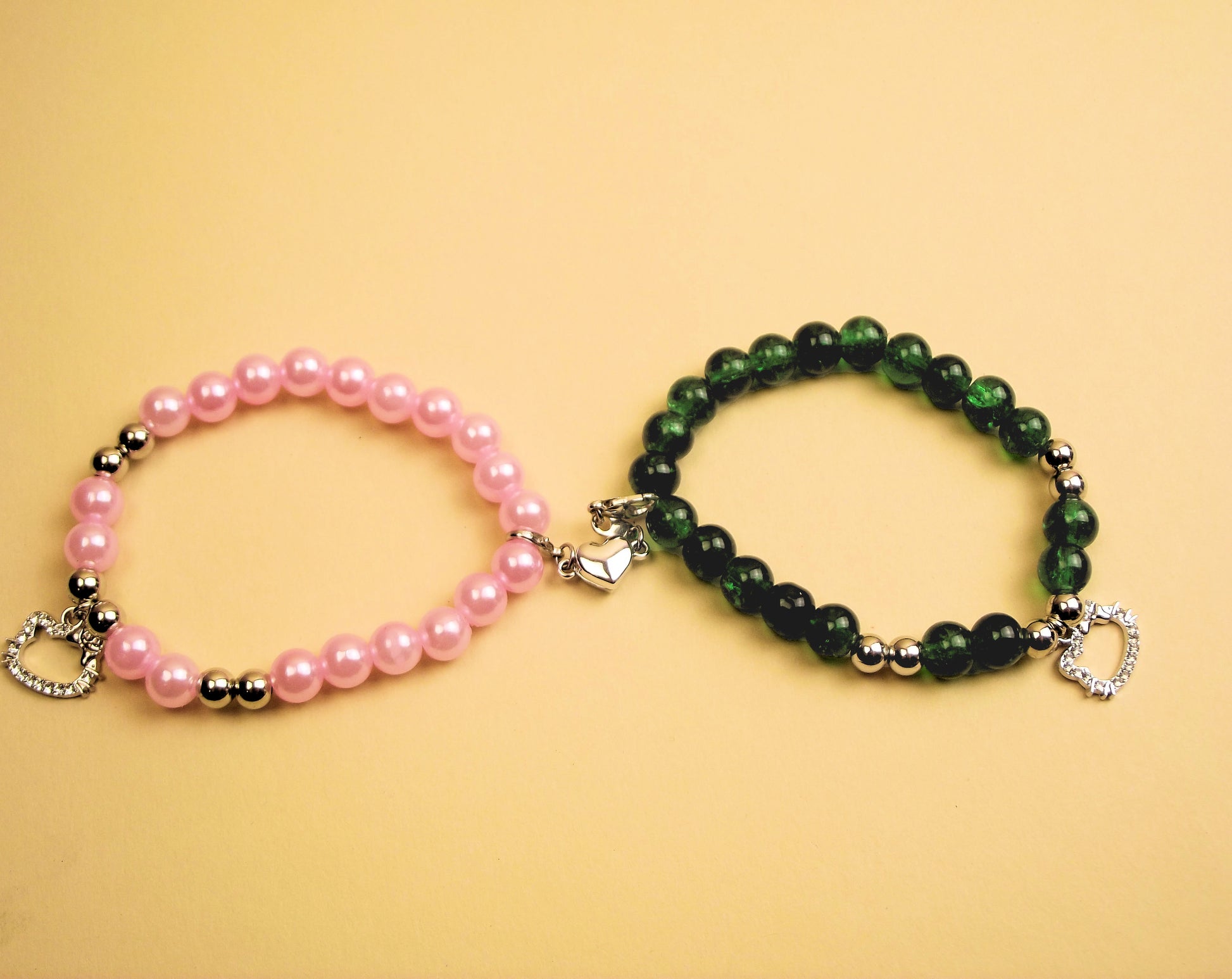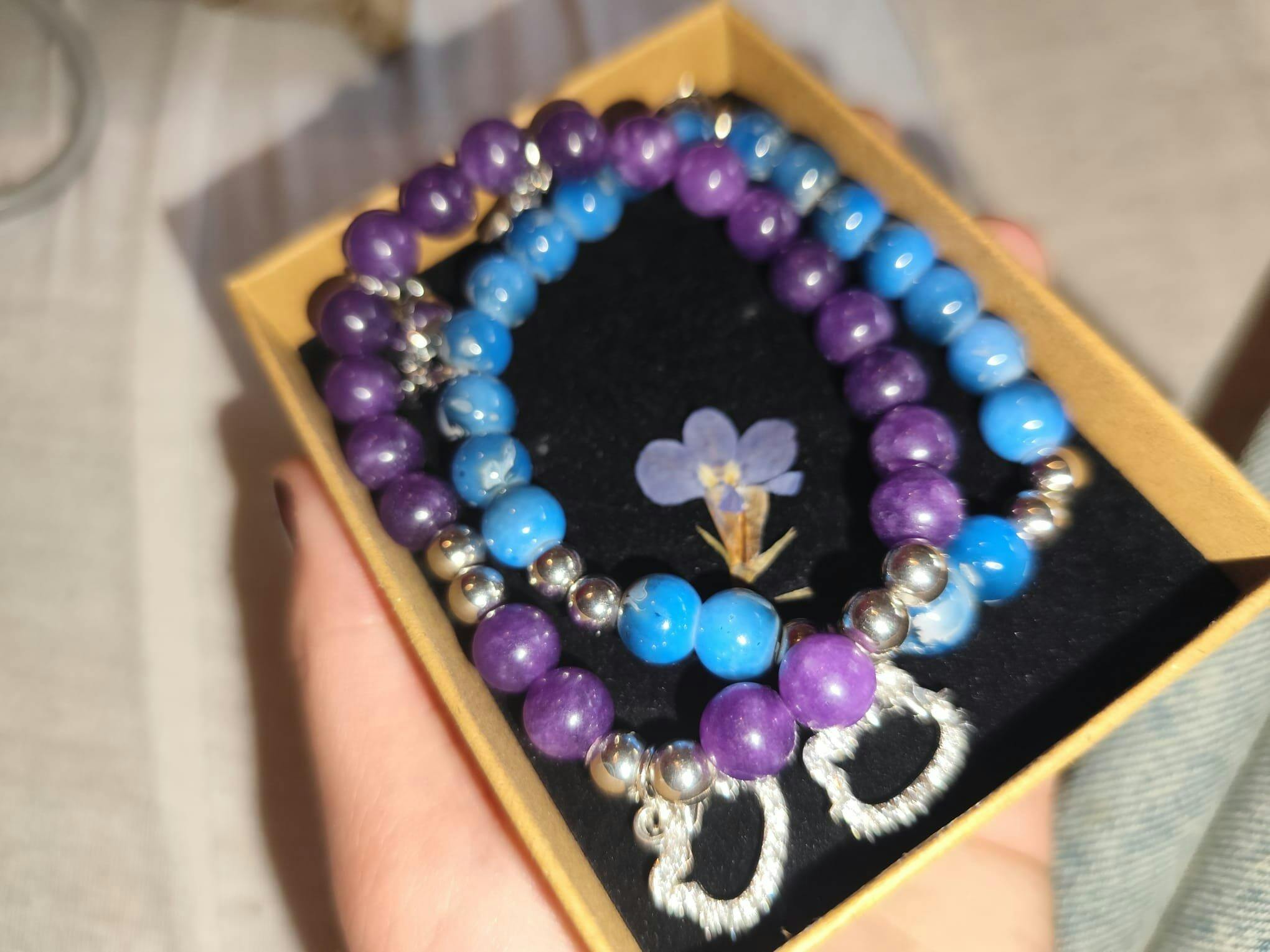 Dieses zauberhafte Armband-Pärchen ist ein Kuscheltraum für eure Handgelenke:"sanfte Perlen und liebevolle Details erzählen von unendlichem Zusammenhalt." Das erste Armband funkelt mit 8 mm blau-schwarzen Marmoriten-Glasperlen, gekrönt von einem winzigen Kitty Anhänger der euch stets ein Lächeln schenkt, und einen zarten Lebensbaum, der eure Freundschaft wurzelt. Das zweite Armband verzaubert mit 8 mm violetten Amethyst-Natursteinen, die in sanftem Licht schimmern, und trägt denselben verspielten Kitty-Kopf und Lebensbaum-Anhänger. Zum süßen Höhepunkt verbinden sich die magnetischen Herz-Verschlüsse, sobald ihr zusammenrückt. Dann zaubern sie im Handumdrehen ein gemeinsames Herz voller Wärme. Jede Perle, jeder Anhänger flüstert:"Mit dir ist mein Herz niemals allein"