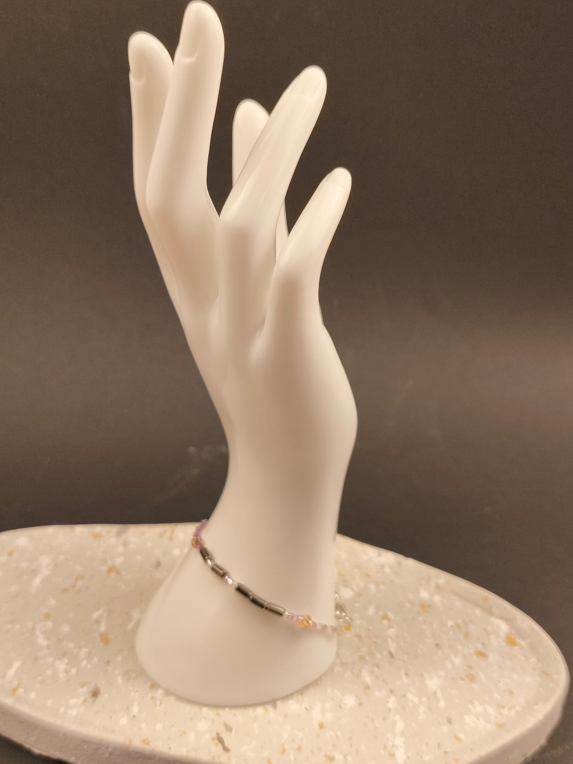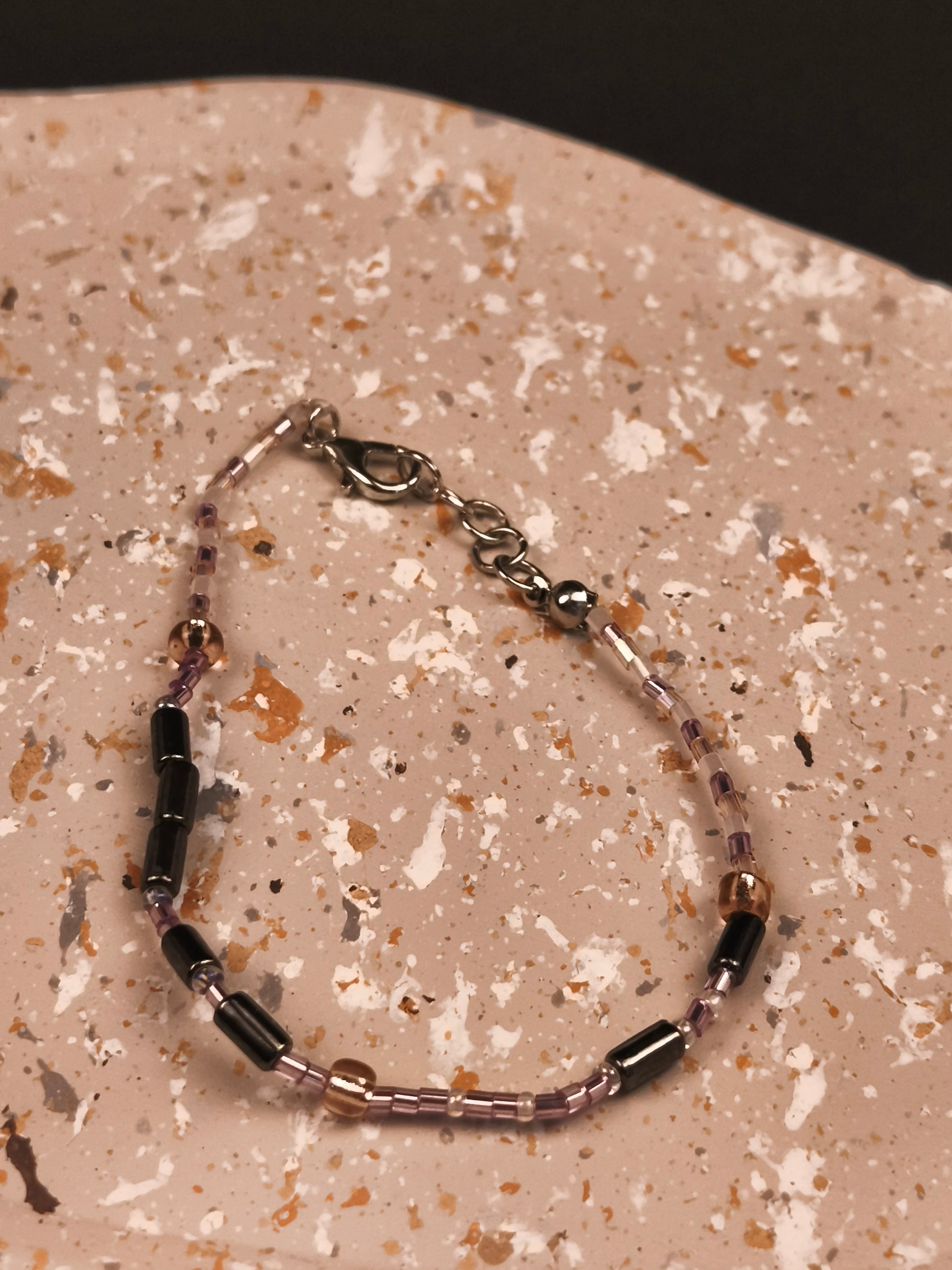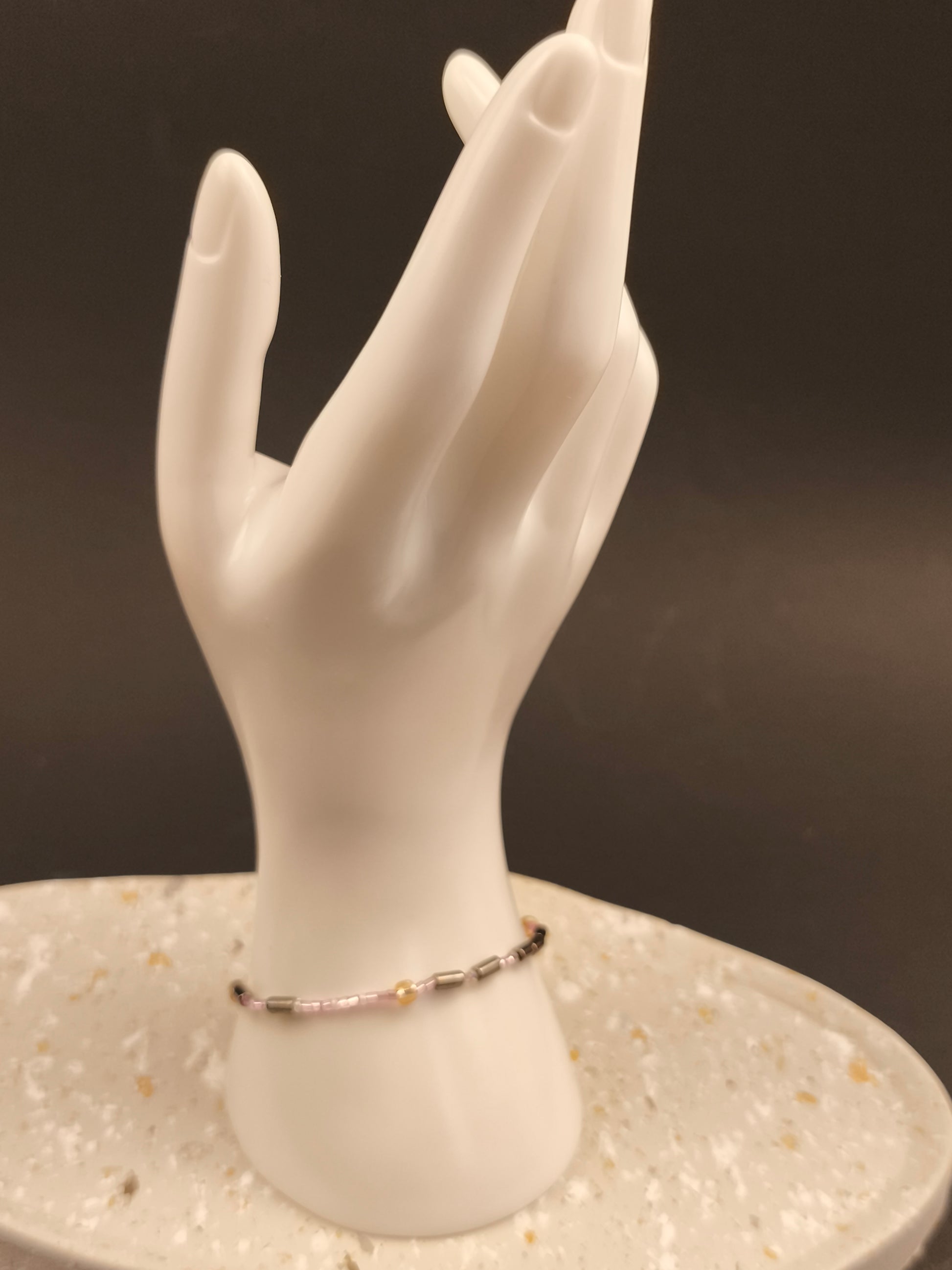 Die Zartflieder Perlen stehen für die zarten Punkte, die Silberperlen für die kraftvollen Striche. Zwischen den Buchstaben funkeln Kristallfarbe Zwischenperlen, die dem Design Wärme und Eleganz verleihen. Die beiden Worte „Soul“ und „Sister“ werden durch eine Champagnerfarbene Perle voneinander getrennt – wie ein leuchtender Moment zwischen zwei Gedanken. Den Abschluss bildet ein gleichmäßiges Muster aus Kristall, Zartflieder und Champagnerfarbene Perlen, das auf beiden Seiten gespiegelt ist. Es rahmt die Botschaft ein wie ein liebevoller Händedruck – still, stark und voller Gefühl.