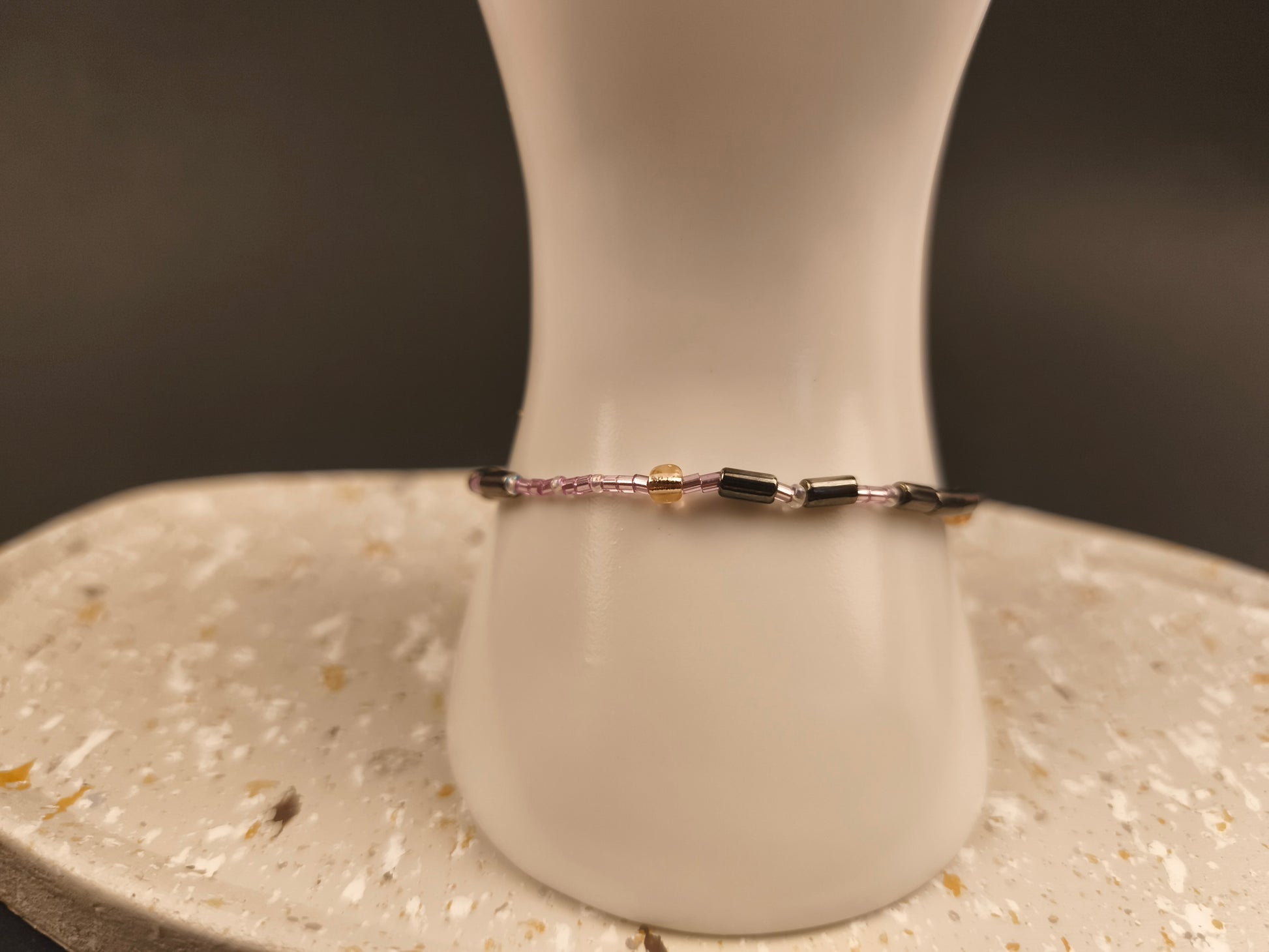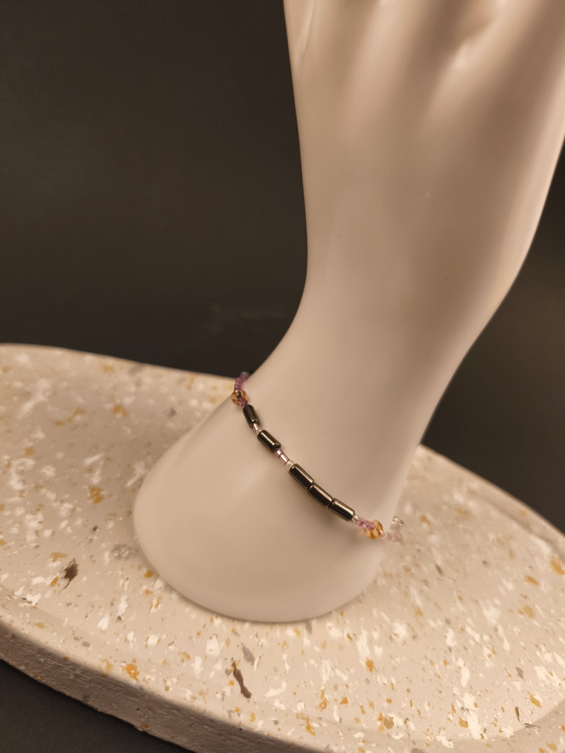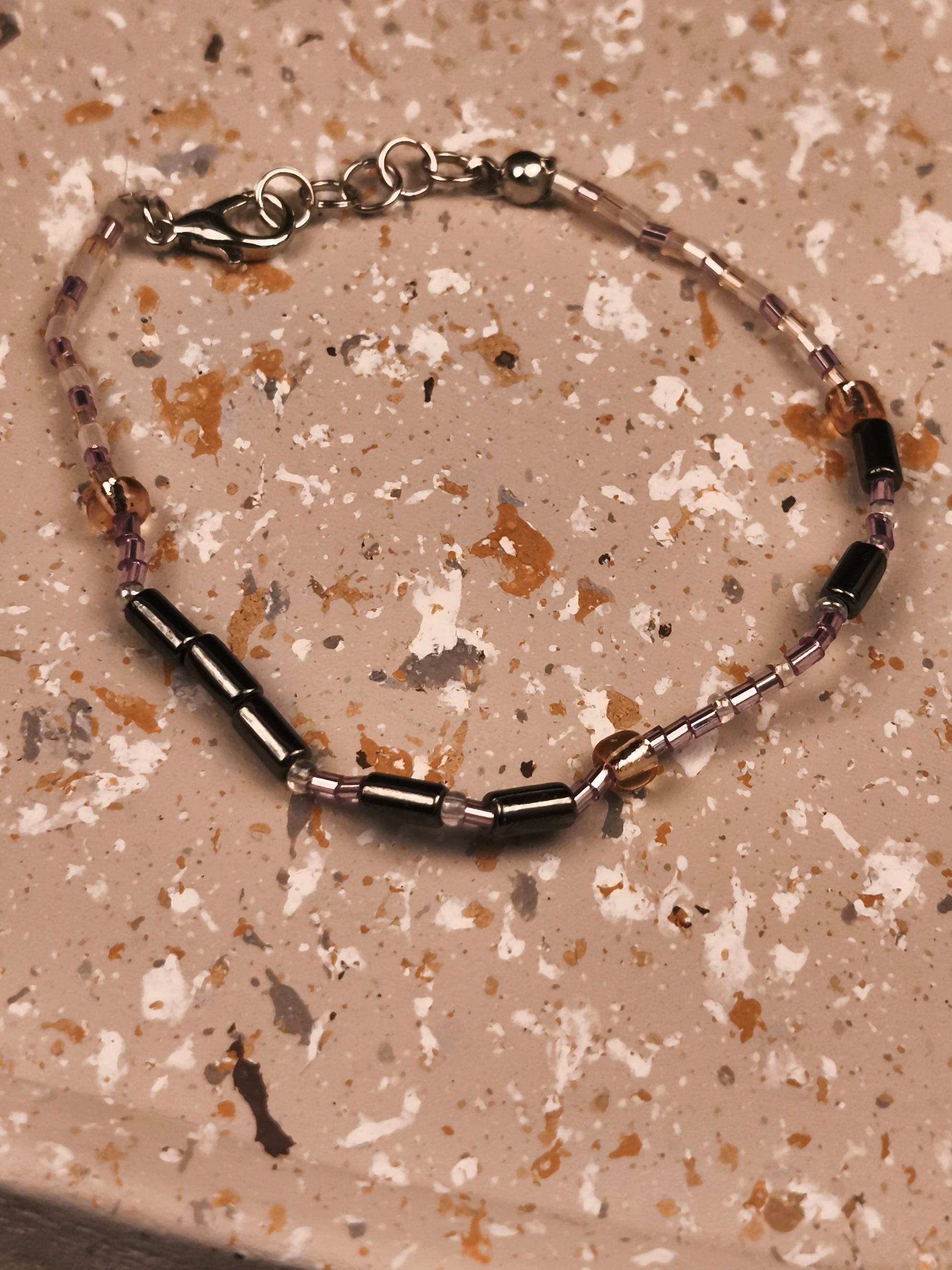 Die Zartflieder Perlen stehen für die zarten Punkte, die Silberperlen für die kraftvollen Striche. Zwischen den Buchstaben funkeln Kristallfarbe Zwischenperlen, die dem Design Wärme und Eleganz verleihen. Die beiden Worte „Soul“ und „Sister“ werden durch eine Champagnerfarbene Perle voneinander getrennt – wie ein leuchtender Moment zwischen zwei Gedanken. Den Abschluss bildet ein gleichmäßiges Muster aus Kristall, Zartflieder und Champagnerfarbene Perlen, das auf beiden Seiten gespiegelt ist. Es rahmt die Botschaft ein wie ein liebevoller Händedruck – still, stark und voller Gefühl.